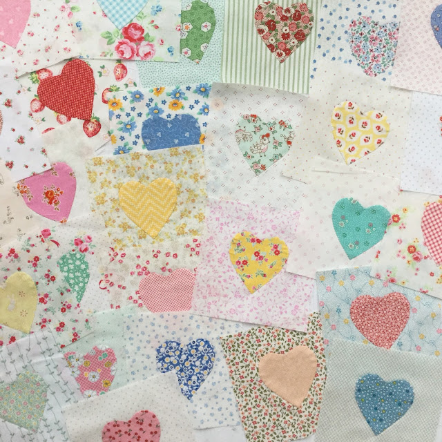 To join the hearts, I had originally thought that I would make 4 patches at random and then sew these together to make the quilt top. However on Saturday, I couldn't resist laying them out to see what they looked like all together.... I went for a layout that had 10 rows with 8 heart blocks per row, (but obviously, you could make a quilt as large or small as you wish).